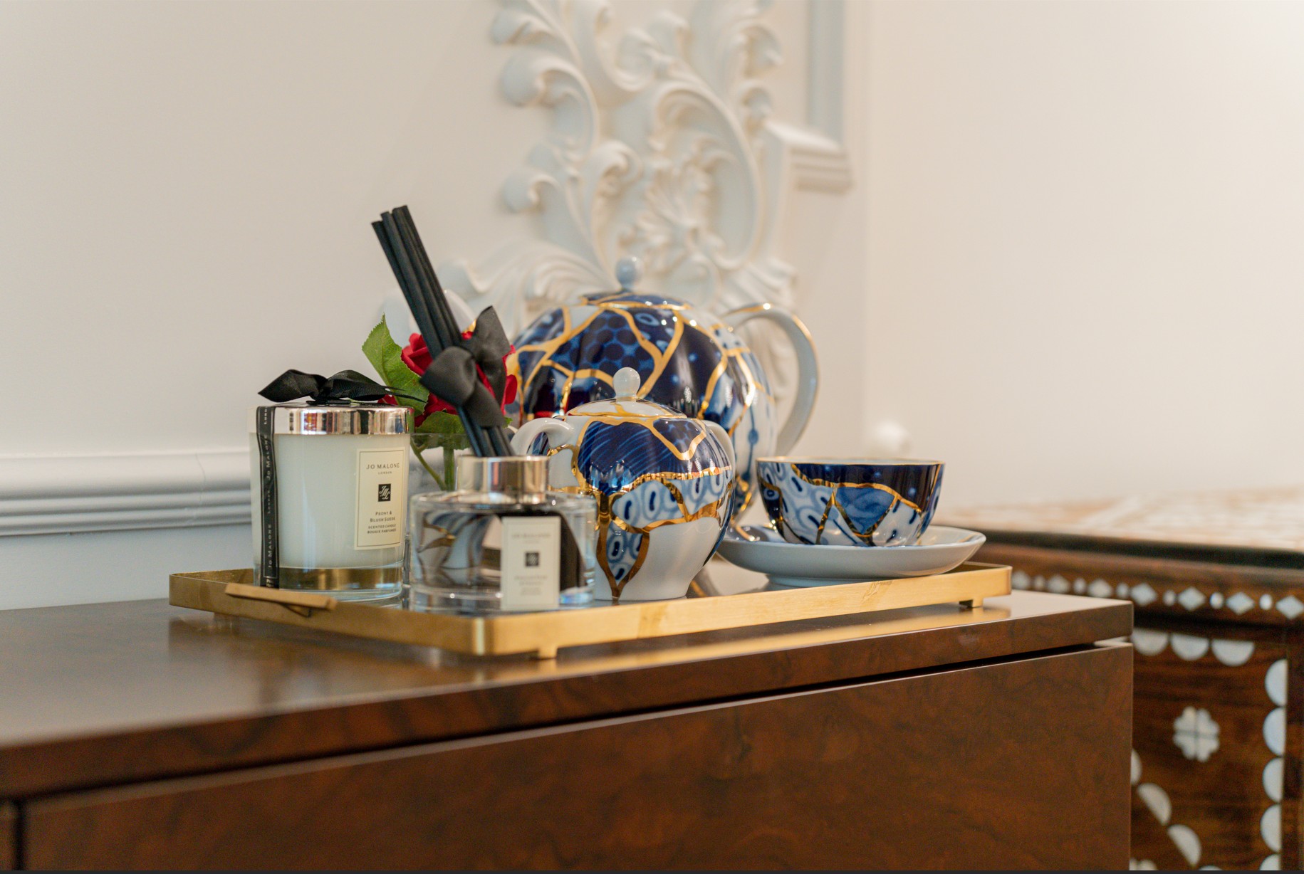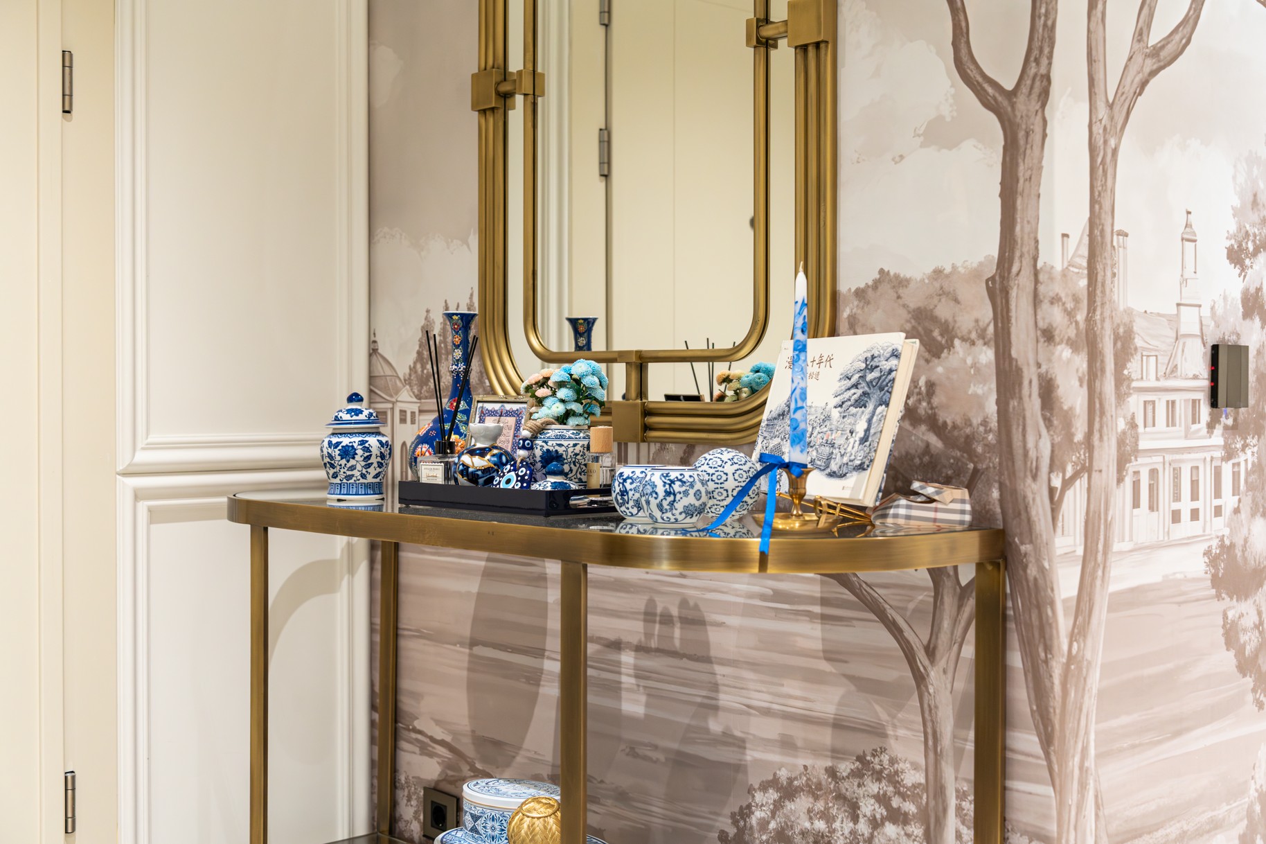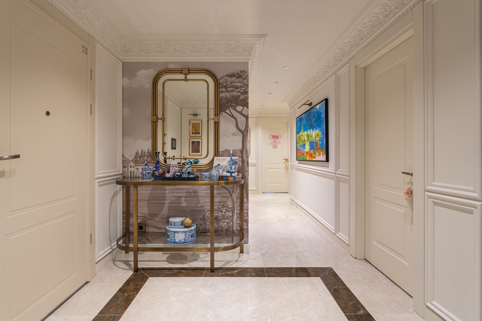 Daire Kahrubā , beyazın sadeliğini kiremit ve toprak tonlarının sıcak enerjisiyle buluşturan, ruhu olan bir yaşam alanı. Modern klasik duvar çıtalamalarının (boiserie) oluşturduğu zarif çerçeveyi, oryantal sanat eserleri ve geleneksel dokunuşlarla doldurduk.