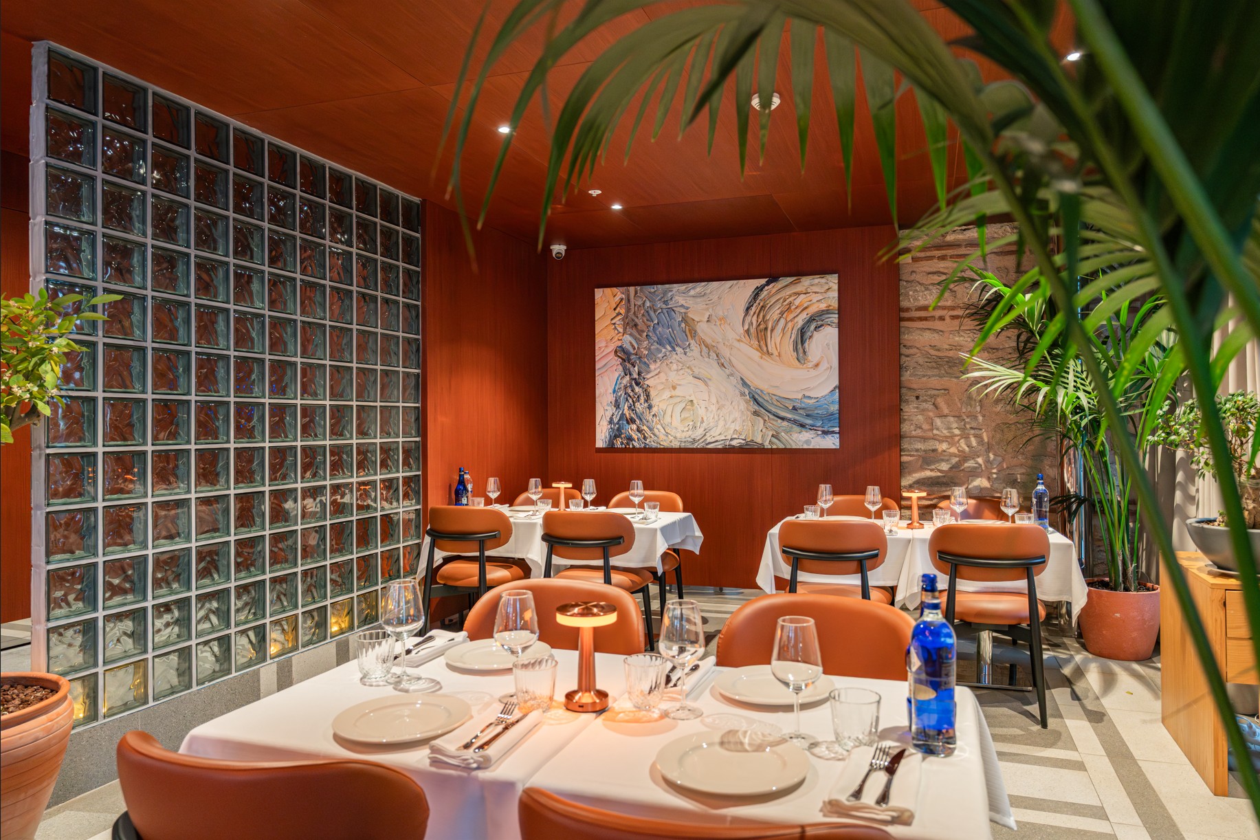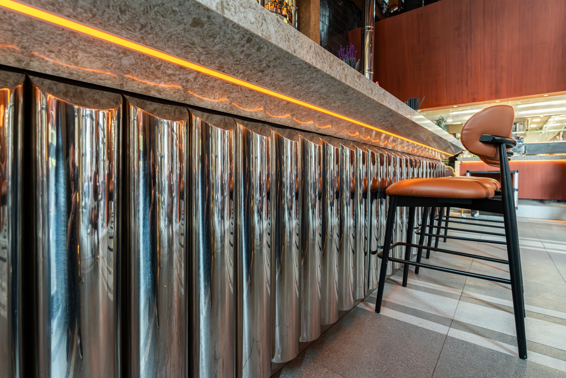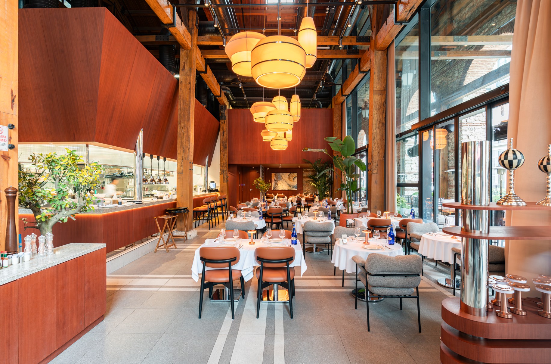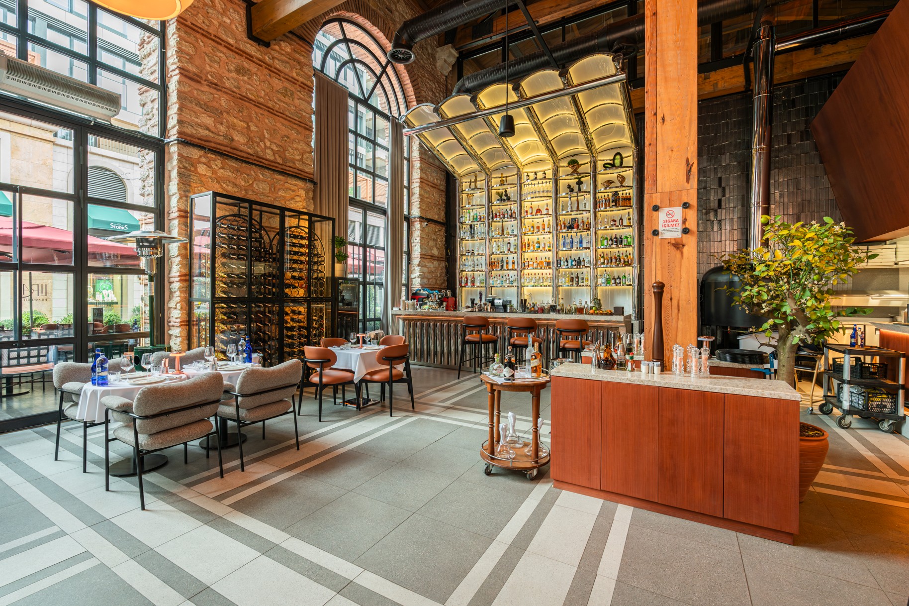 • Öne Çıkan Özellikler: Mekanın hacmini vurgulayan devasa kemerli pencereler, tavana kadar yükselen ve bir sanat eseri gibi duran aydınlatmalı bar ünitesi, endüstriyel geçmişi sergileyen brüt tuğla duvarlar, camlı şarap mahzeni ve açık mutfak konsepti.